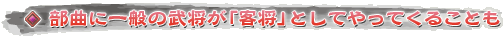部曲員たちが協力して所属勢力の武将に一定量の「納入」を行うと,部曲に「客将」が訪れることがある。客将としてやってくるのは主要武将ではなく,それ以外の一般の武将達だ。客将NPCは合戦場で部曲とともに戦ってくれる。彼らが現れるときには,どこの部曲の客将であるかが合戦場全体にアナウンスされるので,なかなか誇らしい気分になれる。