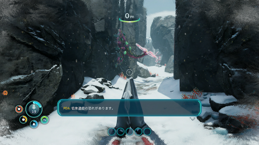オープニングの墜落地点でもあったように,本作では海中だけでなく,雪と氷に包まれた陸地での冒険もある。陸地というのは「流氷」も含まれていて,拠点近くの海面にも流氷が複数浮いている。浮袋で何度も飛んでいたら,流氷の上に何やらペンギンっぽい生物がいるのを発見したので,「新しい生物を見かけたら,スキャナーで即調査だ」と調べてみると……。