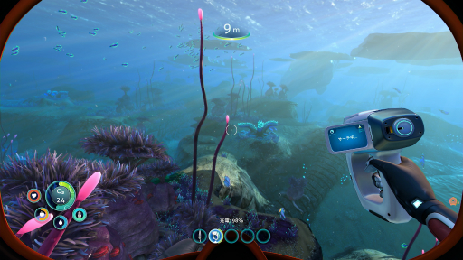 海中を航行できる乗り物はバッテリーが搭載されており,それが切れないうちは,搭乗中に酸素の心配をしなくていい点が便利だ。とくに序盤は呼吸のために海面に戻ることを念頭に置いての行動となるのだが,前作とは異なり,今回は海面が氷で覆われている箇所もある。呼吸のために急いで浮上したものの,氷に阻まれてあえなく溺れる……なんてことも。この点だけを見ても,乗り物の重要性が増している。