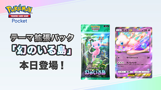 本作のリリース後、初めてテーマ拡張パックがラインナップに追加されました。新拡張パック「幻のいる島」は、幻のポケモン・ミュウをはじめとした、多彩なポケモンたちが登場いたします。島の風景が描かれたカードやコレクションファイルが登場するなど、幻のポケモンを追い求める冒険を楽しめます。