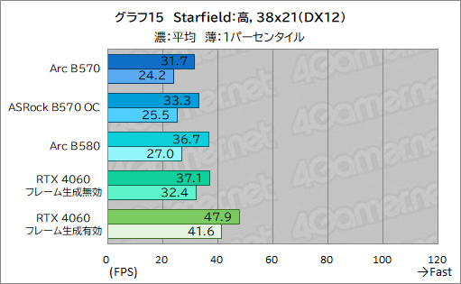 グラフ15〜17は,Starfieldの結果だが,ここでもArc B570は,RTX 4060にかなり離されてしまっている。