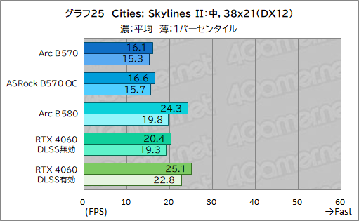 Cities: Skylines IIの結果がグラフ25〜27だが,ここでは再びArc B570が,RTX 4060に引き離されている。